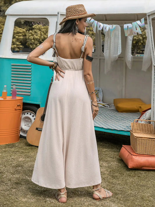 Waffle-Knit Tied Spaghetti Strap Dress